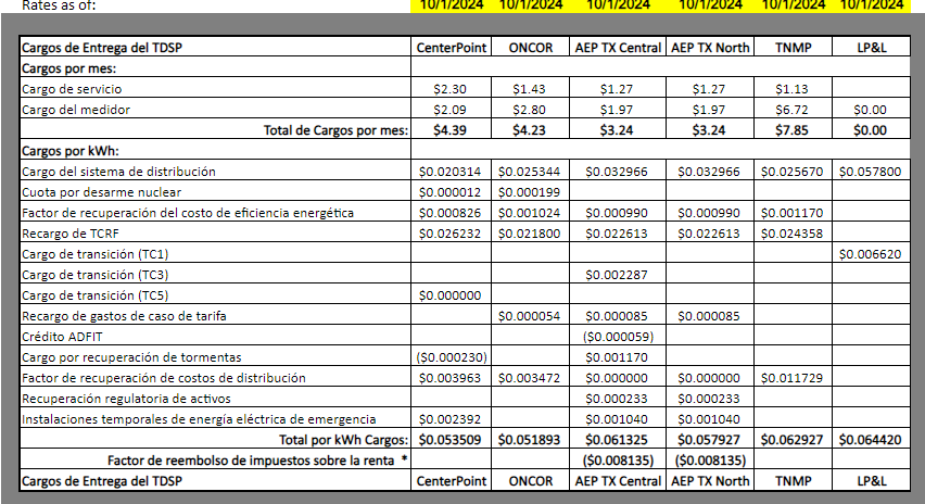 Estos son los Cargos por Entrega de tu Proveedor de Servicios de Transmisión y Distribución (Transmission and Distribution Service Provider, TDSP) a la fecha del 15 de Abril de 2023. Estas cantidades son cobradas por el TDSP por la entrega de electricidad al cliente a través de postes y cables, y otras instalaciones del TDSP, sin incluir los cargos discrecionales. Los Cargos por Entrega son transferidos sin margen de ganancia para Cirro Energy.