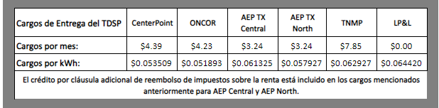Los Cargos por Entrega son aprobados por la Comisión de Servicios Públicos de Texas y aplican a todos los clientes residenciales, que reciben servicio del TDSP, sin importar quién es su proveedor minorista de electricidad. Los Cargos por Entrega aparecen en una sección separada de la factura mensual bajo la descripción “Cargos por Entrega” para puedas encontrarlos fácilmente.