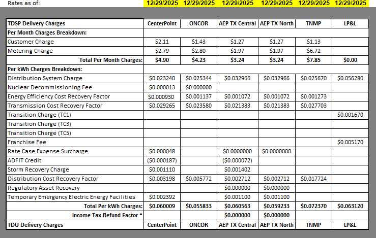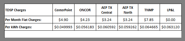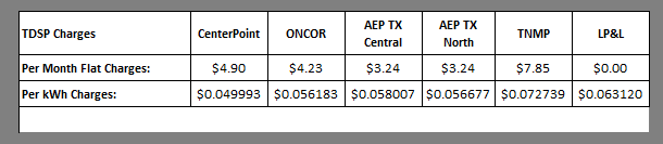 Certain TDSP charges are billed based on your billing cycle, and some are billed on a usage basis (per kilowatt hour). For this reason, the total Delivery Charges amount will vary each billing cycle depending on your billing cycle's kilowatt-hour usage. See the table below for an itemized listing of the detailed charges that make up Delivery Charges in your area.